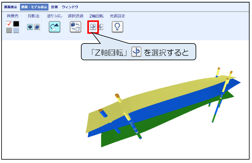 がZ軸反時計回り、がZ軸時計回りにモデルを回転させます。以下のイメージでは(Z軸反時計回り)の場合を例にしています。