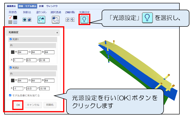 「光源設定」コマンドでモデルに当てる光宇の設定を変更できます。