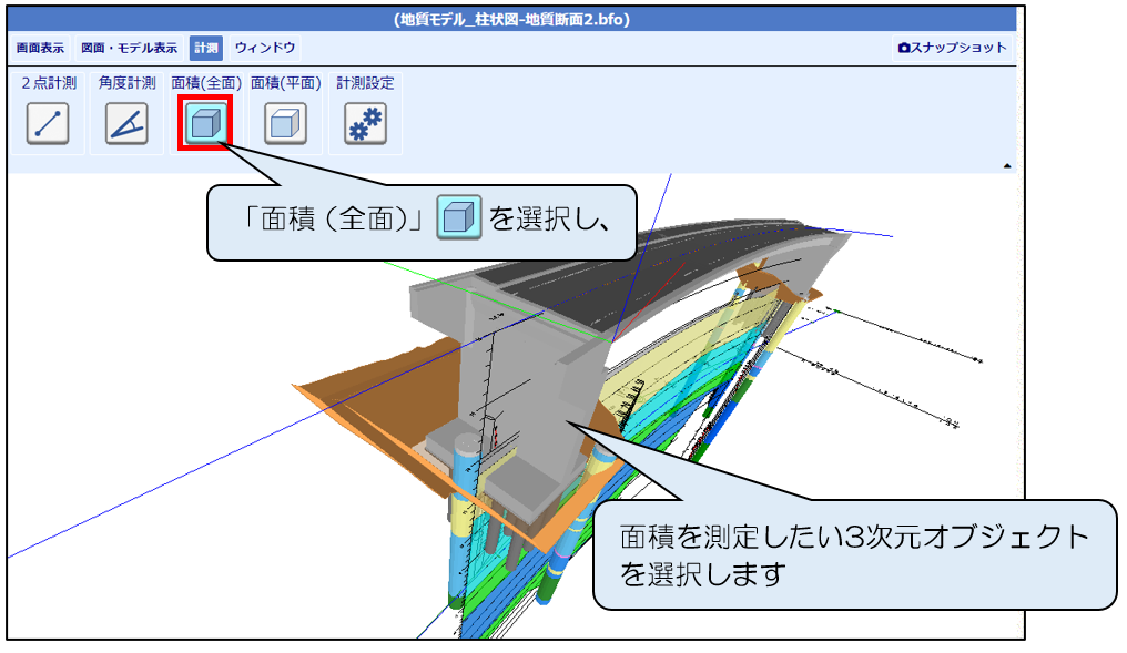 「面積(全面)」を選択し、面積を測定したい3次元要素を選択します。