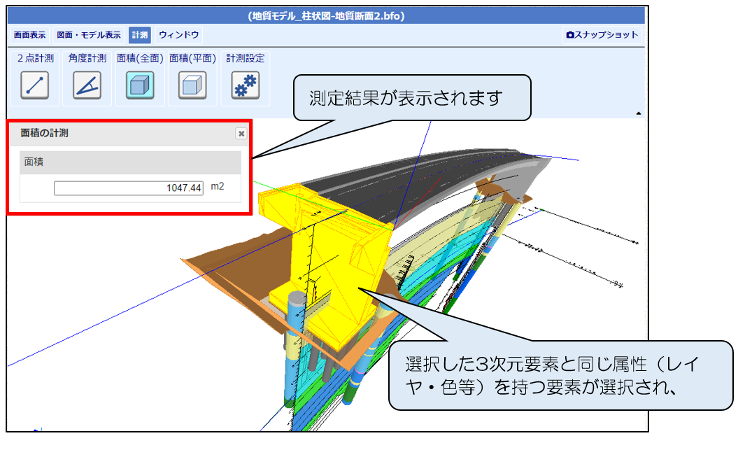 選択した3次元要素と同じ属性(レイヤ・色等)を持つ全要素が選択(着色)され、面積の測定結果が表示されます。