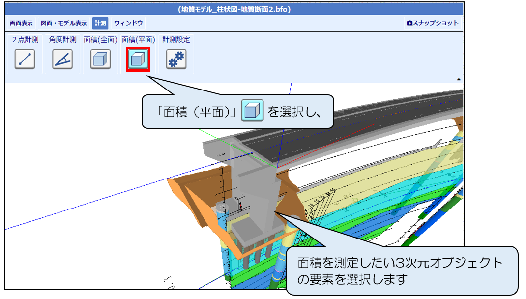 「面積(平面)」を選択し、面積を測定したい3次元要素の部分を選択します。