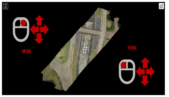 ・マウスの右ボタンを押した状態で、マウスを移動させると(右ドラッグ)、マウスを移動させた方向に点群データが移動します。