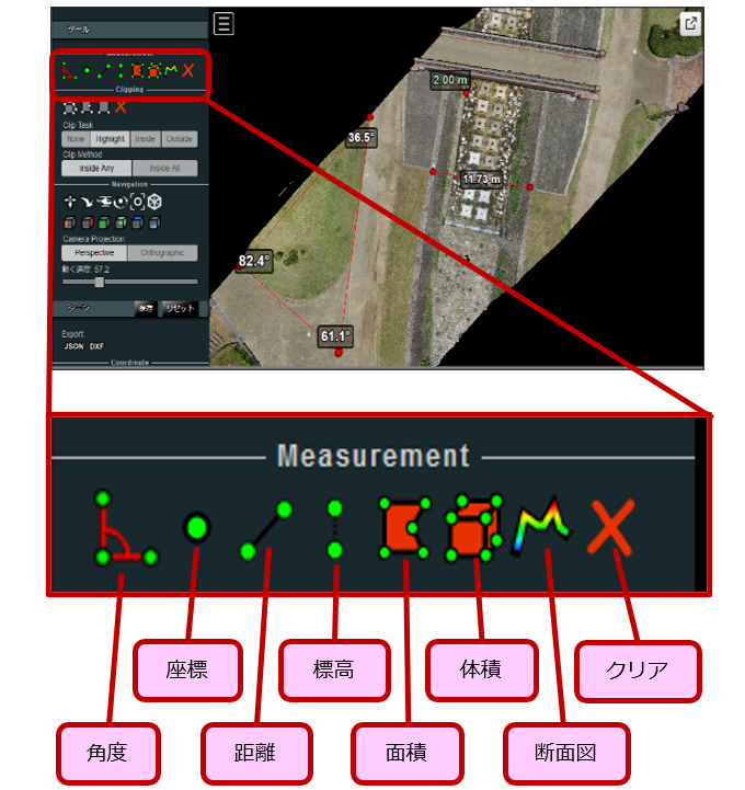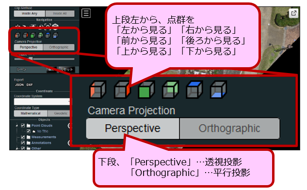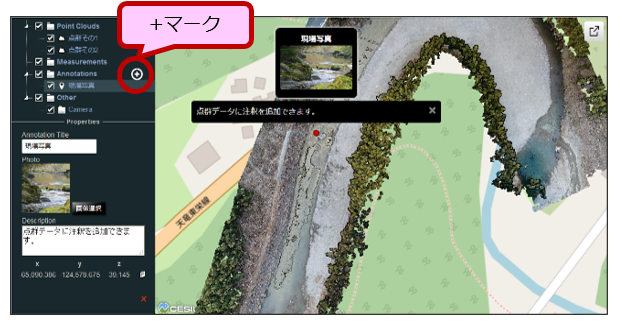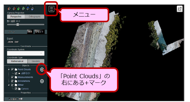 ※メニュー内「シーン」の[保存]ボタンを押すと、点群の情報や追加した注釈を保存できます。