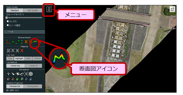 左上のメニューを選択し、中央付近にある「Measurement」の中から断面図アイコンを選択します。