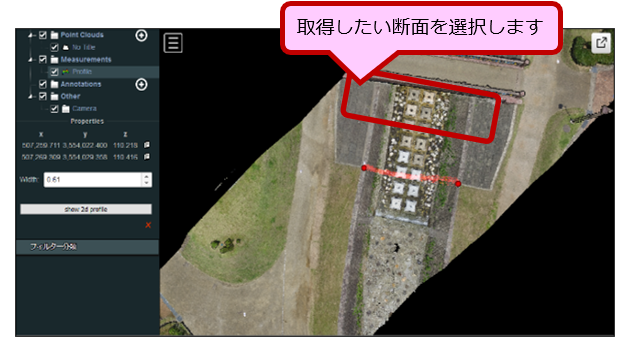 左メニューの下の「Properties」欄にある[show 2d profile]ボタンを押すと、取得した断面が表示されます。
