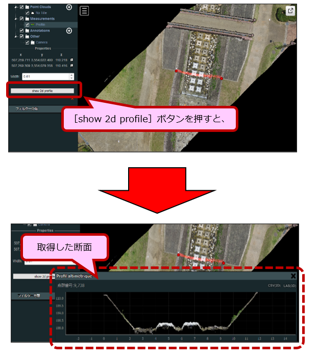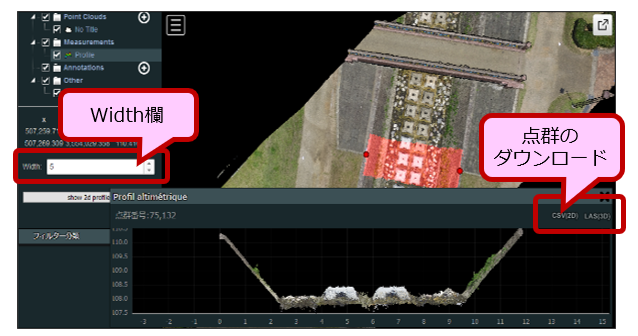 断面表示の右上にある「CSV(2D)」または「LAS(3D)」を選択すると、断面の情報をダウンロードできます。