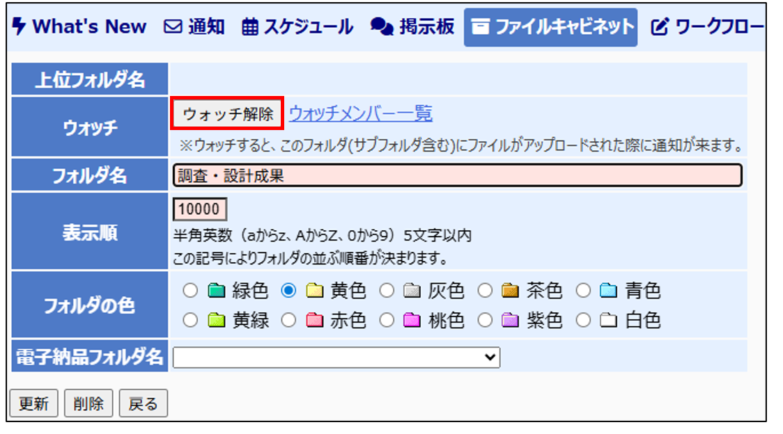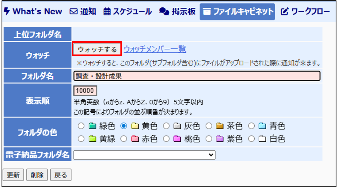 ファイルキャビネットには特定のフォルダに対してファイルが登録されたことをメールにてお知らせするウォッチ機能がございます。
